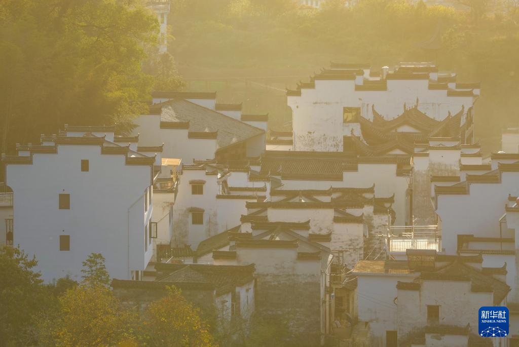 11月9日,婺源县庐坑村的徽派民居在夕阳照射下,粉墙黛瓦仿佛披上了一层金色的外衣。  初冬时节的江西婺源,徽派建筑和田园风光交相映衬,构成一幅幅色彩斑斓的画卷,吸引各地游人前来游览。 11月10日,游客游览婺源篁岭景区。